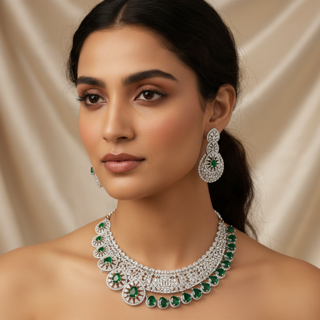 This rhodium-plated necklace set features exquisite emerald-green teardrop stones framed by sparkling AAA-grade cubic zirconia (American Diamonds), creating a breathtaking contrast that radiates sophistication.