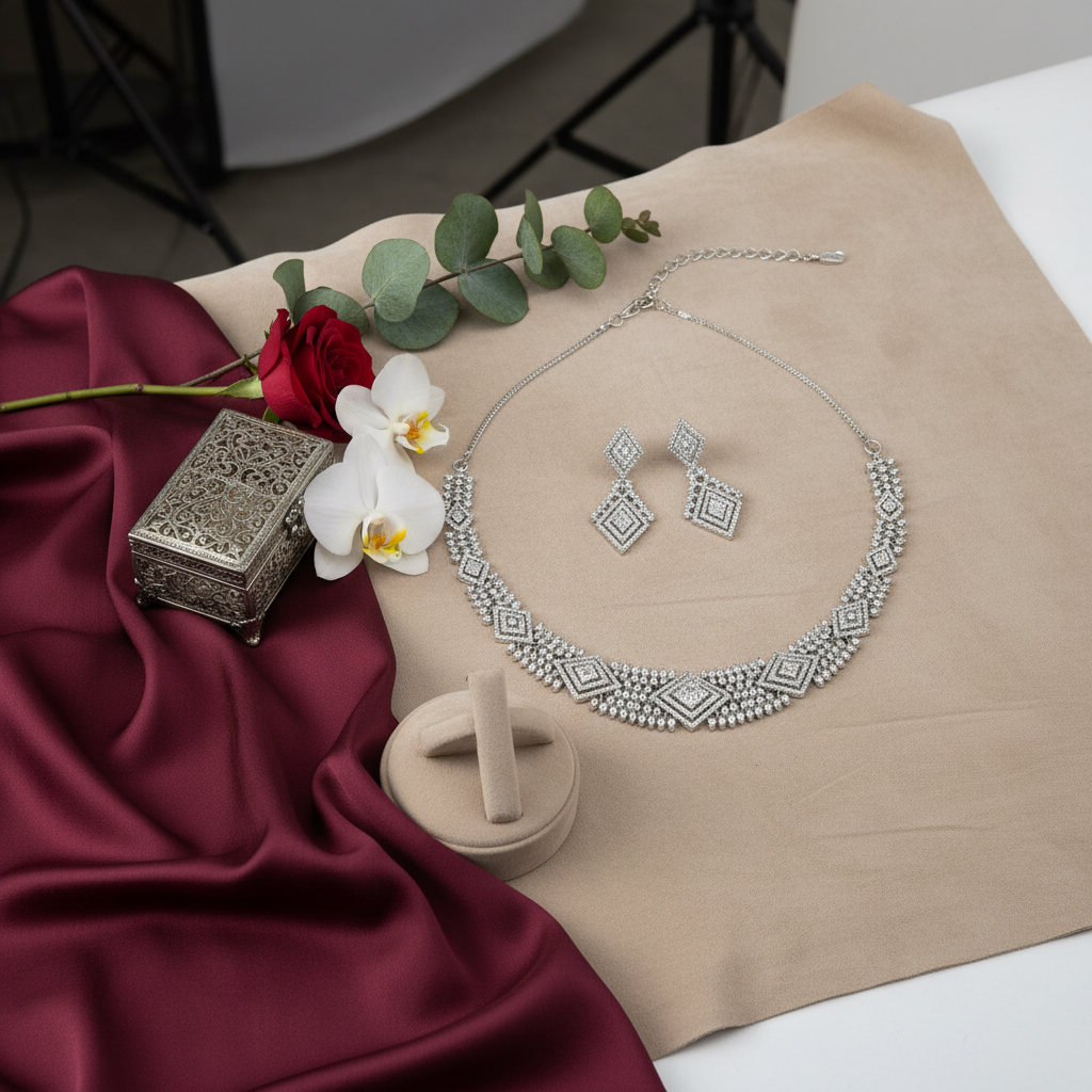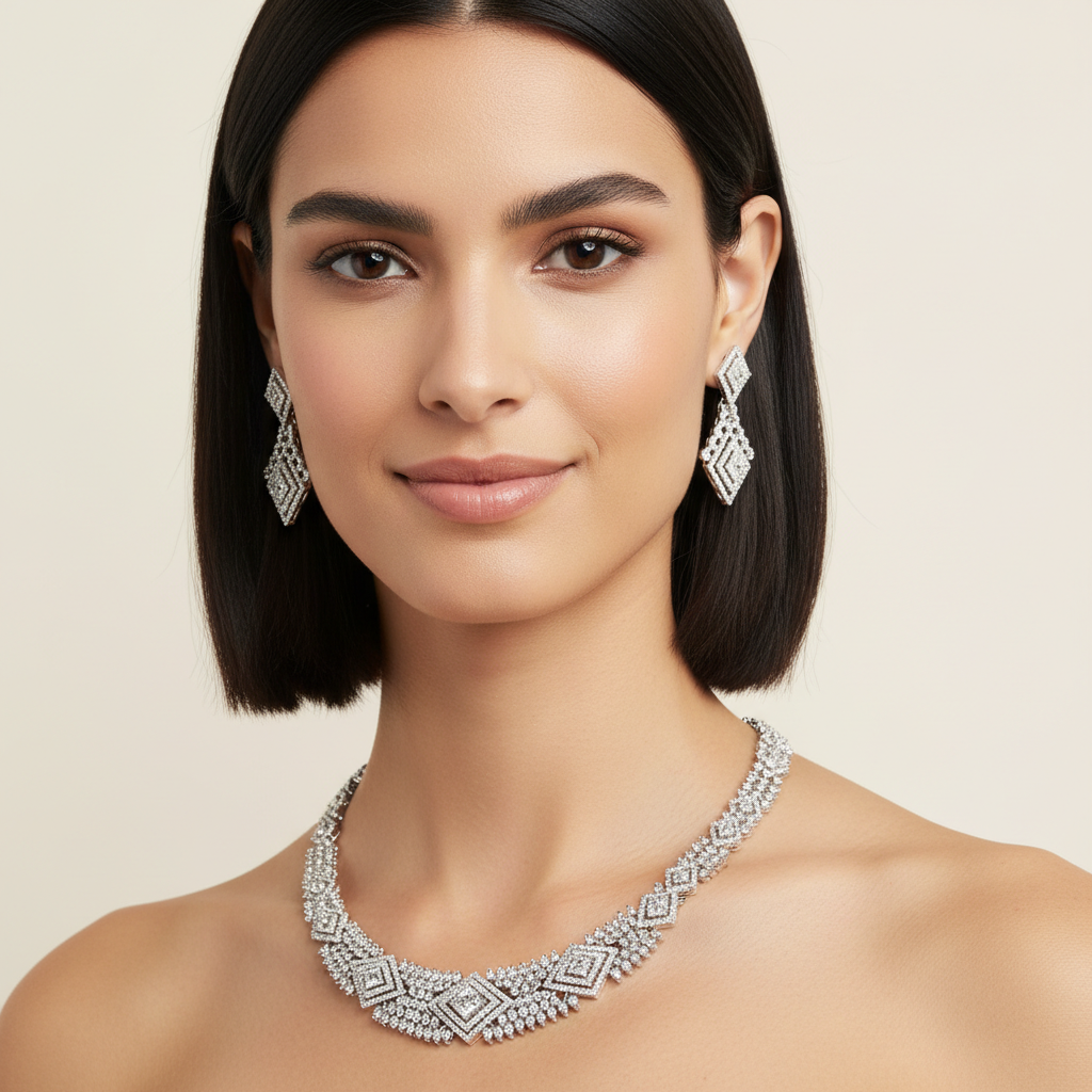 Discover modern glamour with Diadeep’s Silver American Diamond Geometric Necklace Set, a stunning fusion of elegance and artistry.